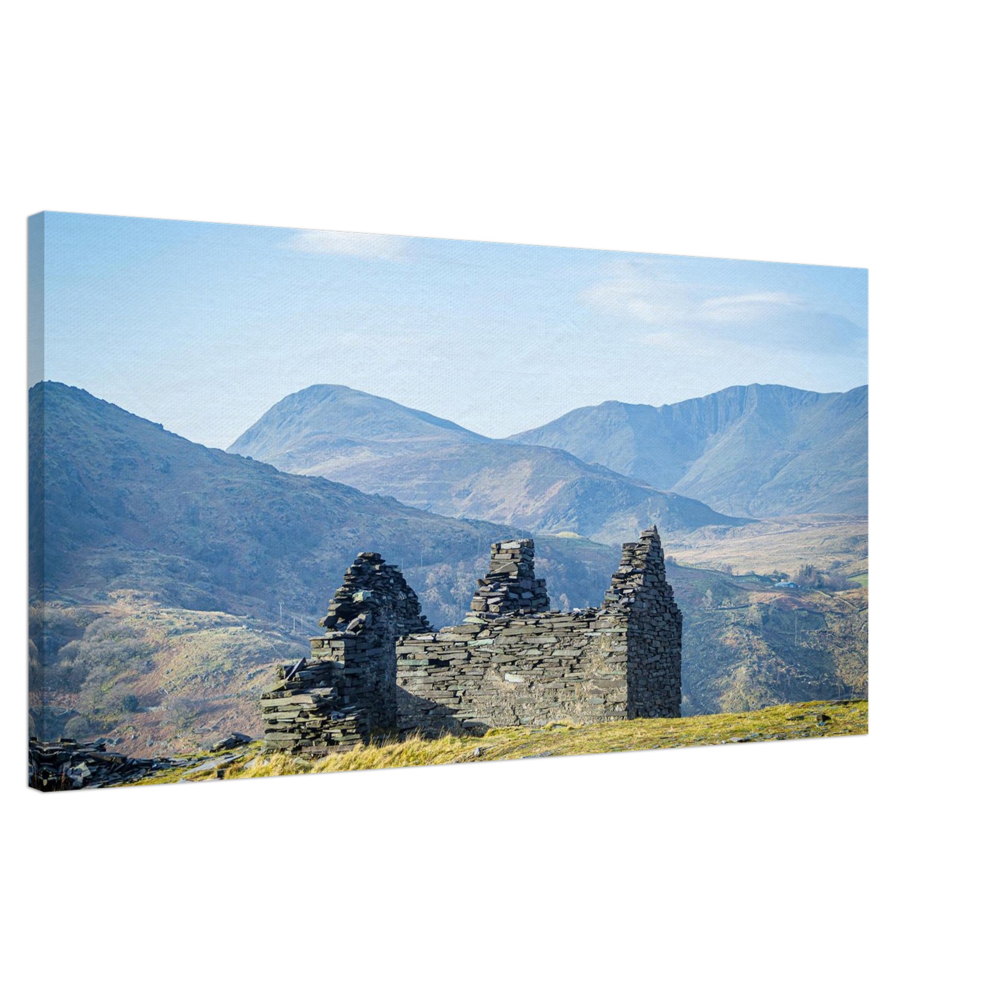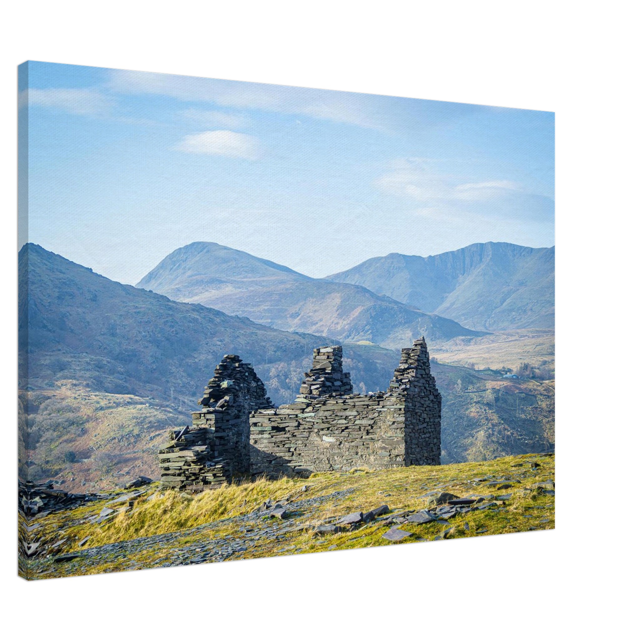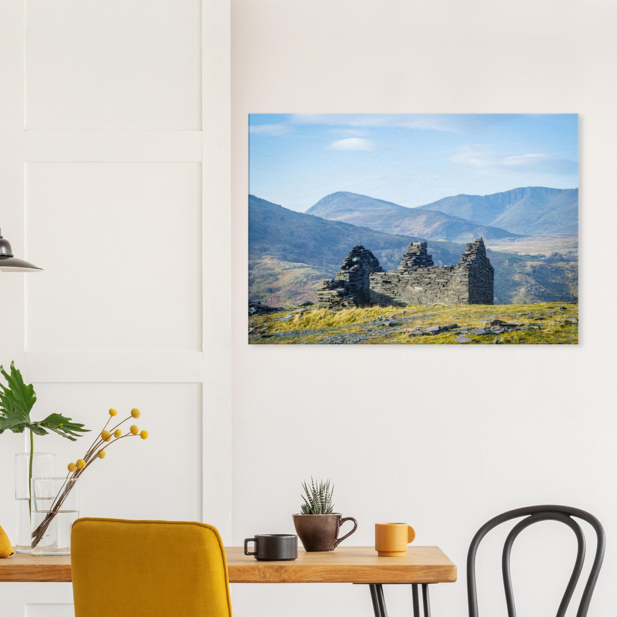 Transform your living space with our stunning Abandoned Dwelling canvas print, capturing the serene beauty of the mountainous landscapes in Snowdonia National Park. Photographed during the enchanting spring gold hour, this art piece beautifully showcases the natural sculpture of the majestic mountains against a calming blue skyline.