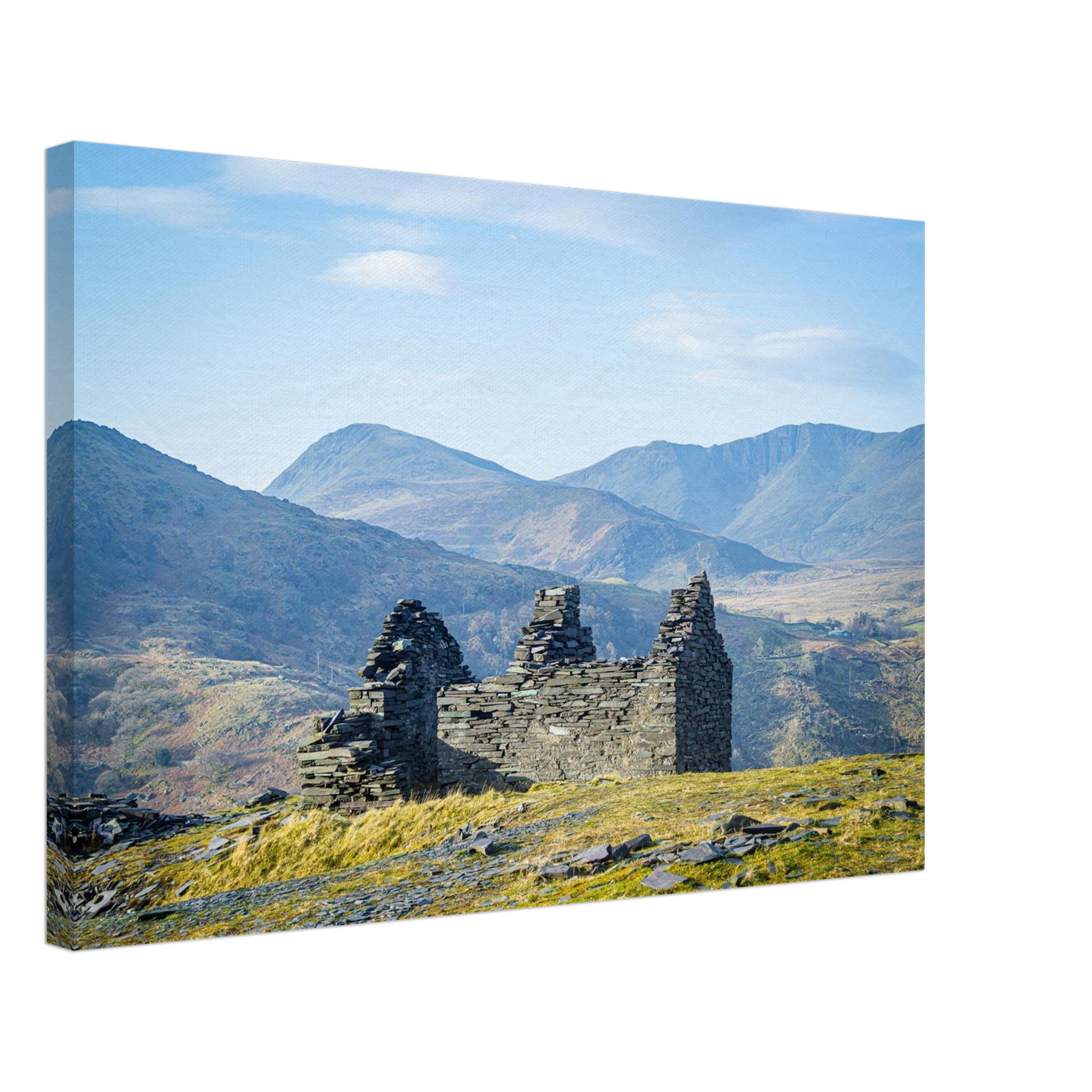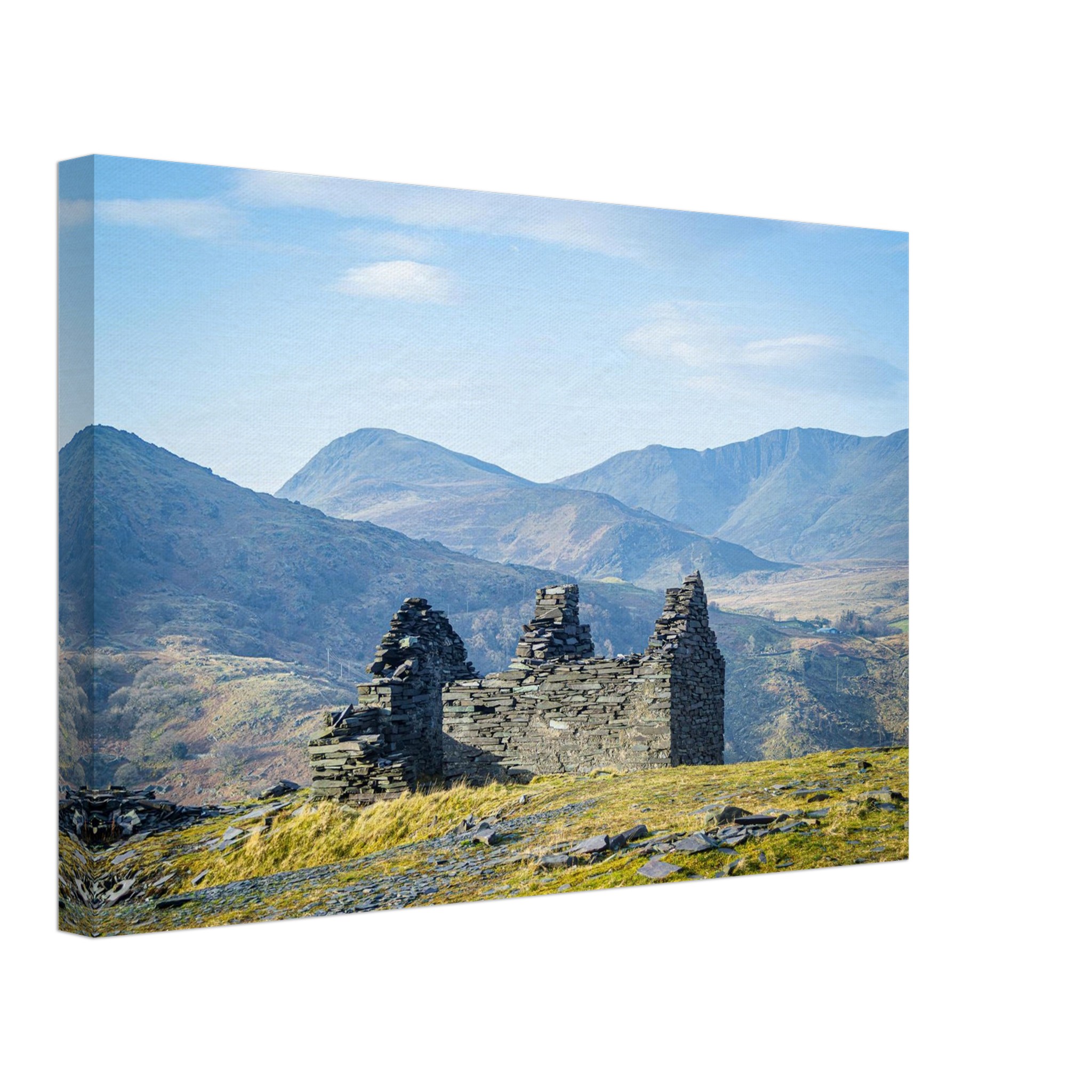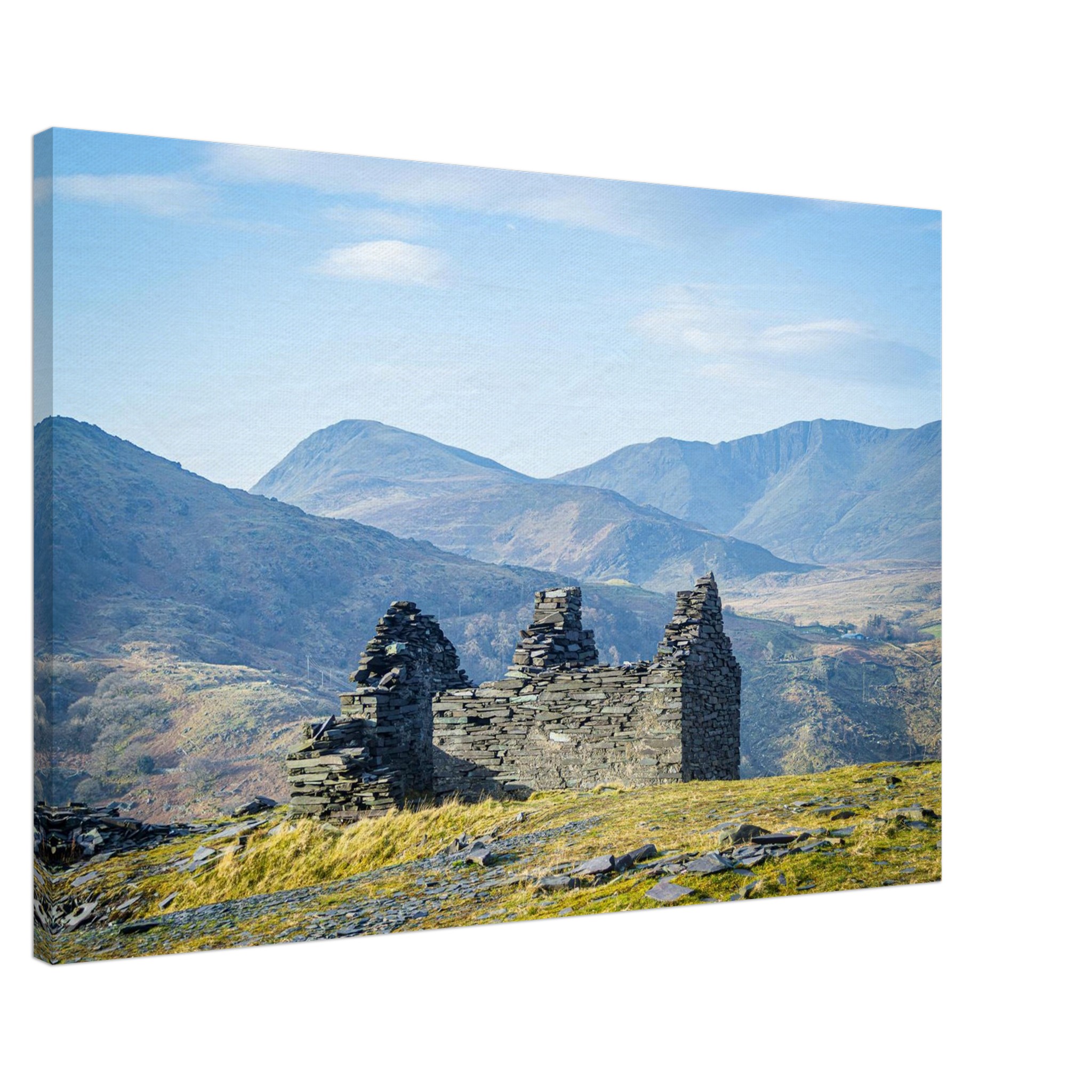 Transform your living space with our stunning Abandoned Dwelling canvas print, capturing the serene beauty of the mountainous landscapes in Snowdonia National Park. Photographed during the enchanting spring gold hour, this art piece beautifully showcases the natural sculpture of the majestic mountains against a calming blue skyline.