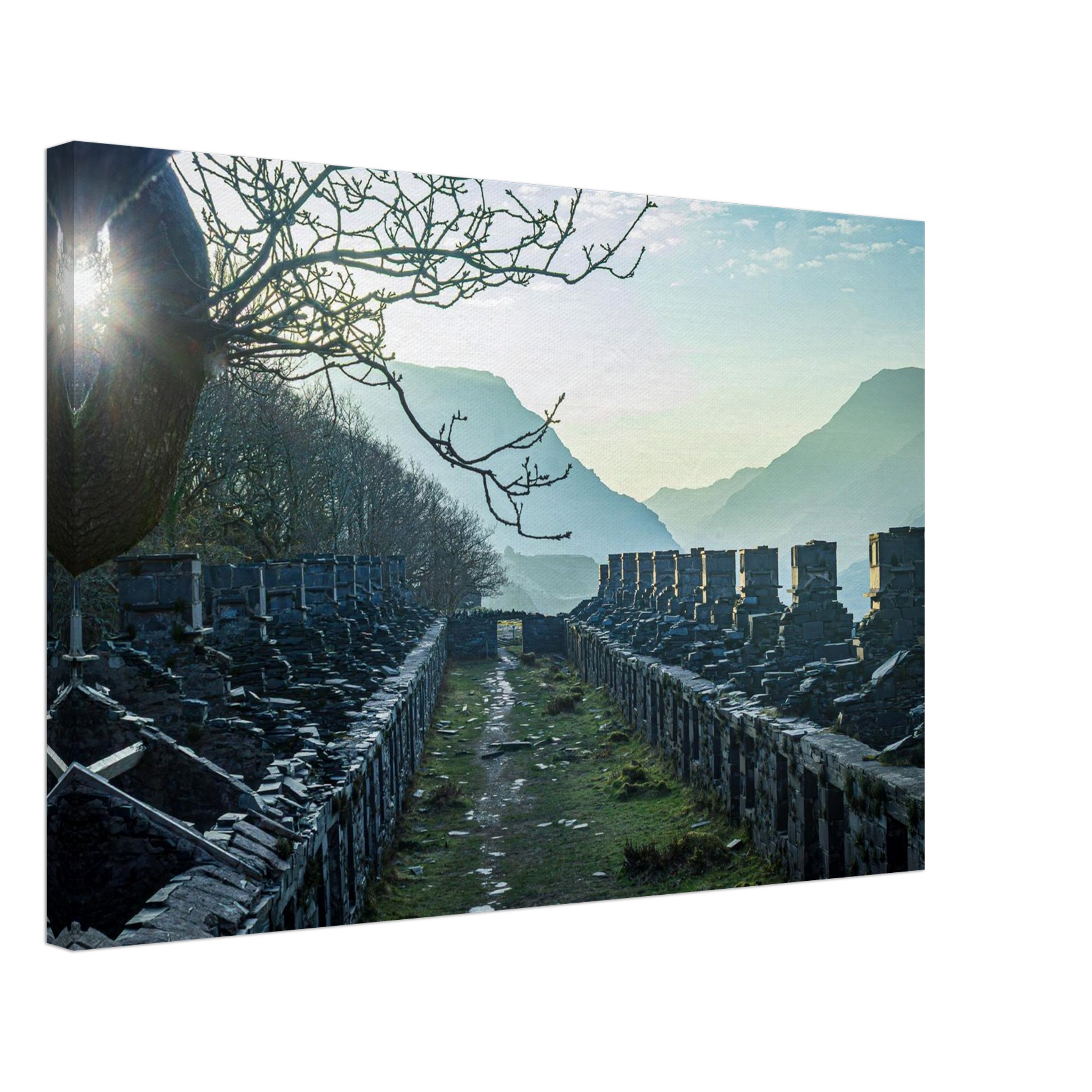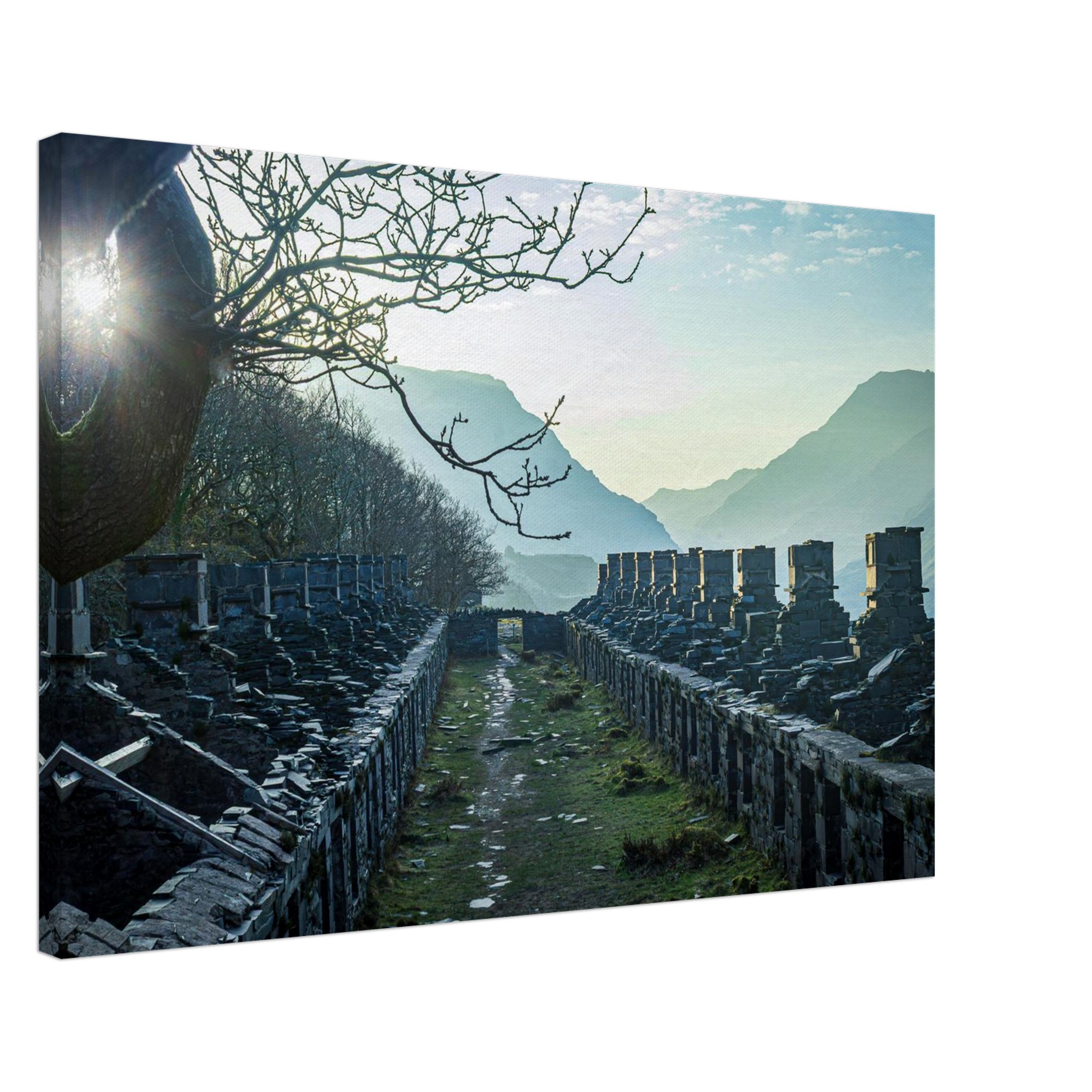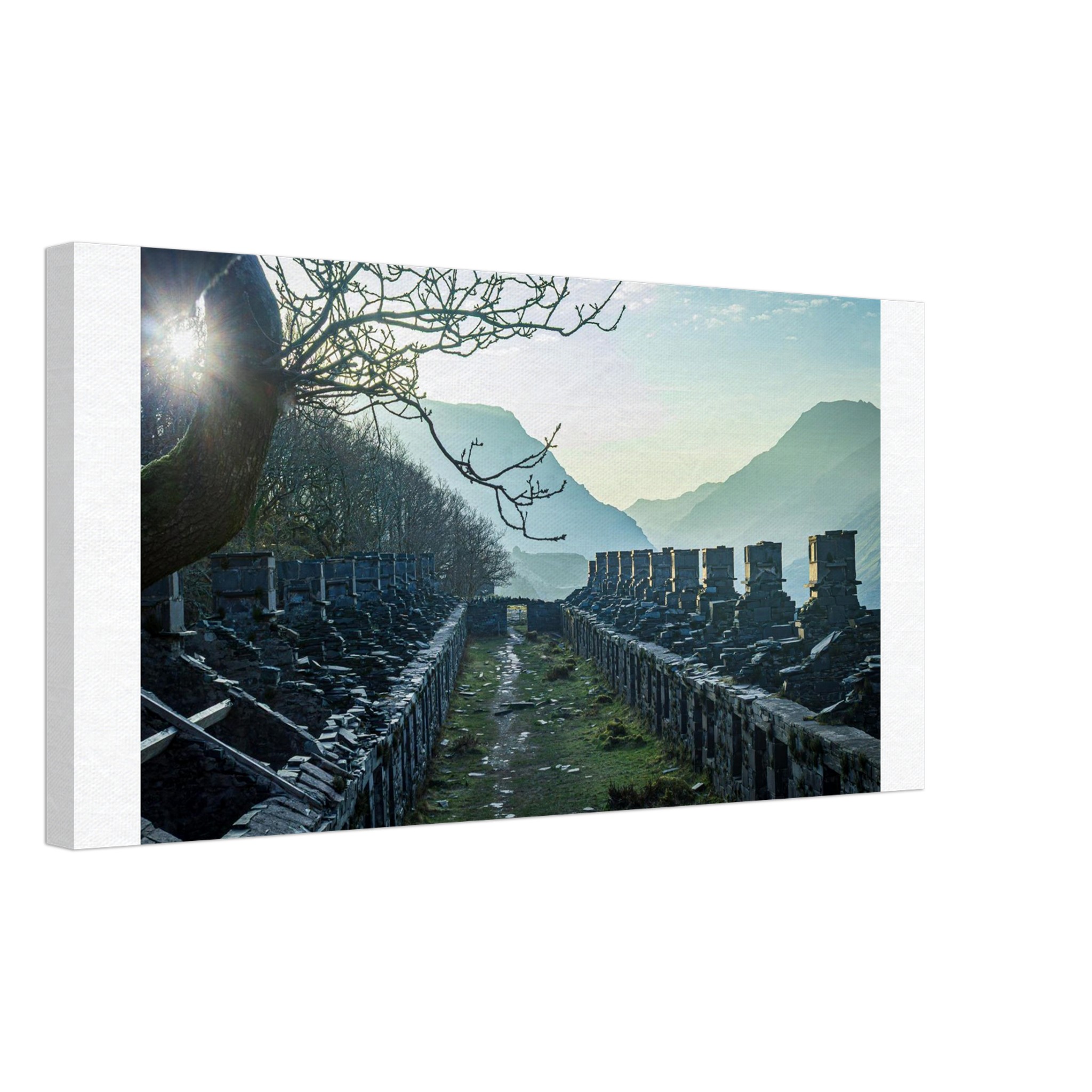 Transform your space with our breathtaking Anglesey Barracks Sun Bath canvas print, capturing the enchanting dawn light during spring in Snowdonia National Park, North Wales. This stunning artwork captures the glorious golden hour, bringing it into your home and making it a perfect centerpiece for any room.