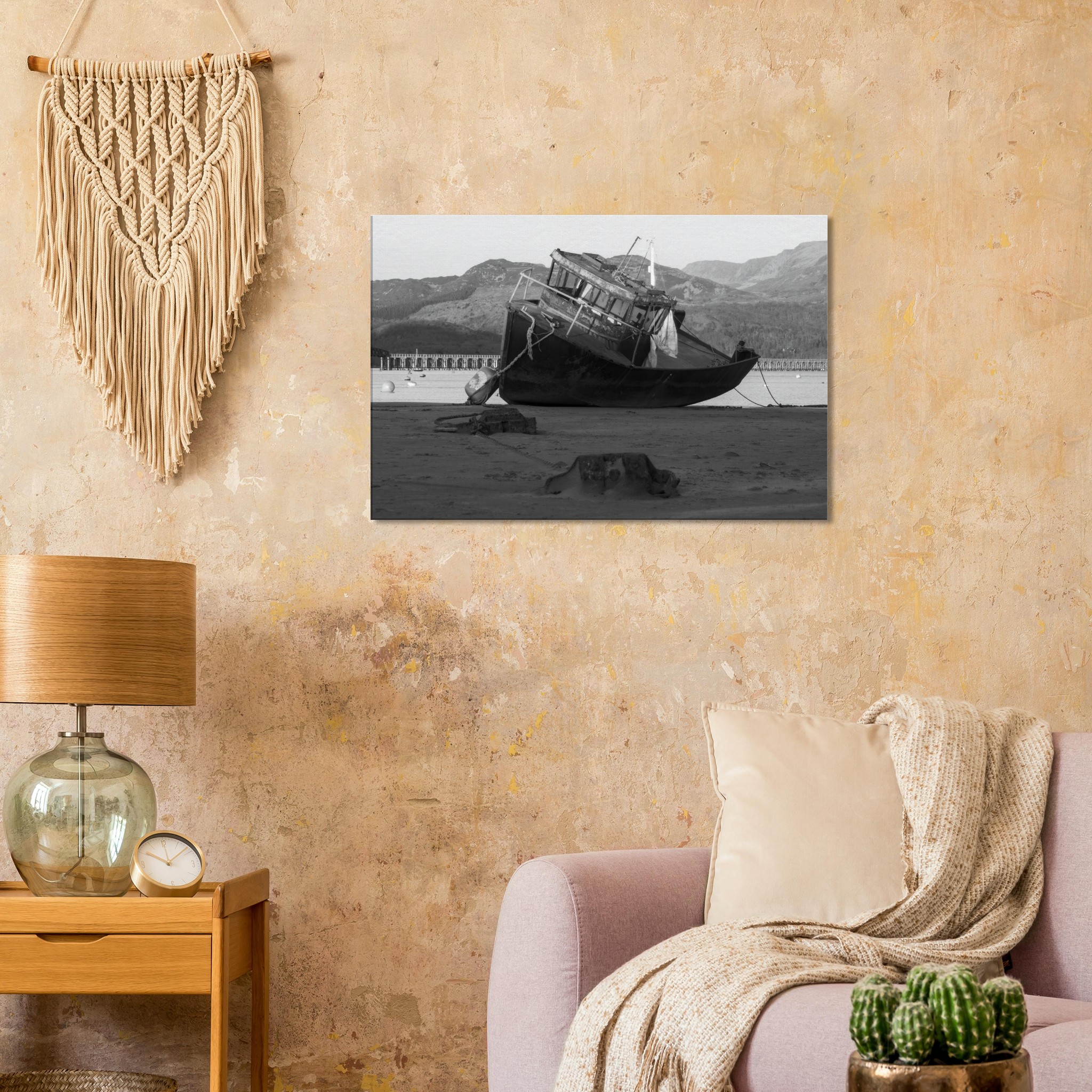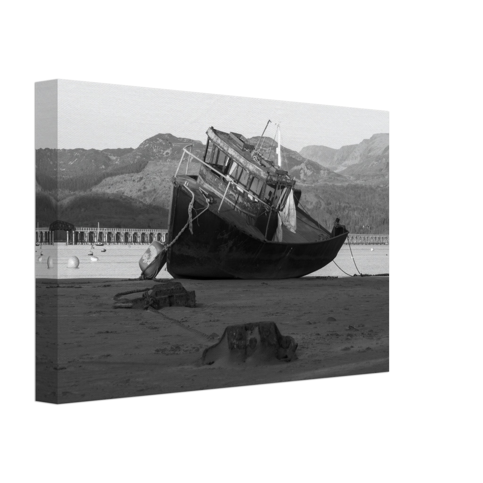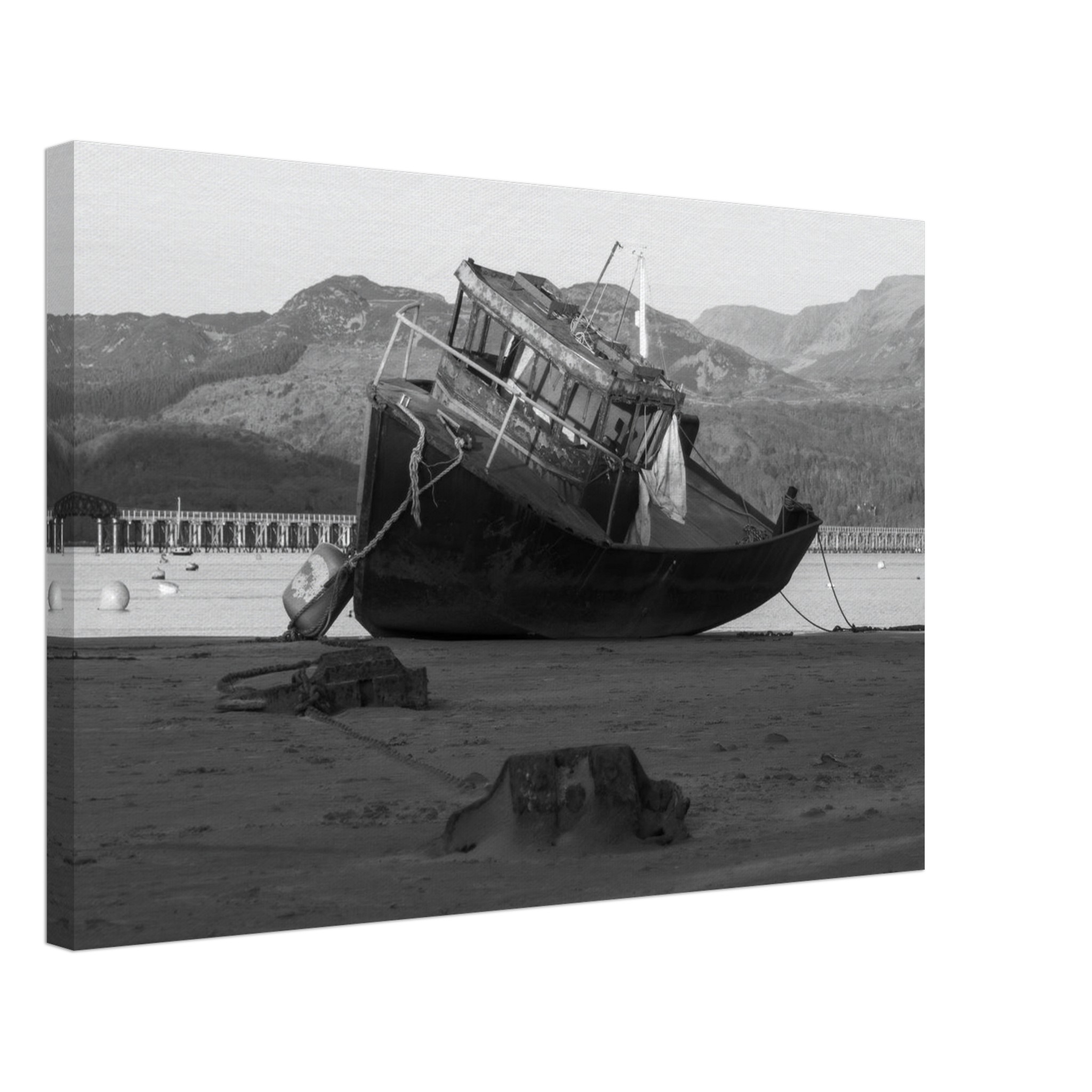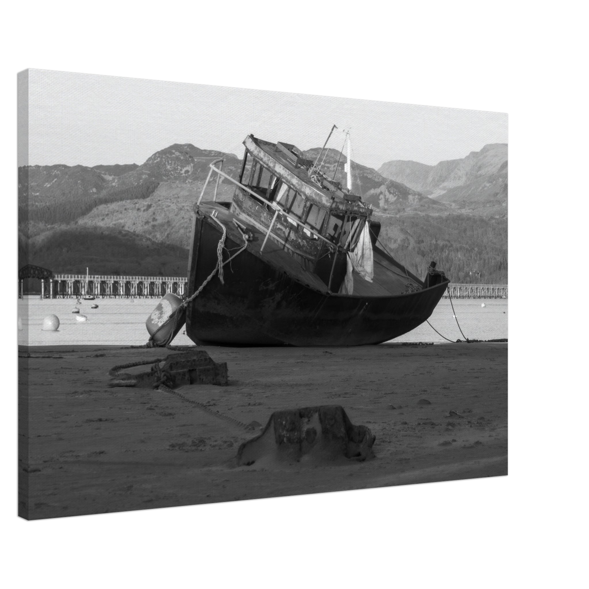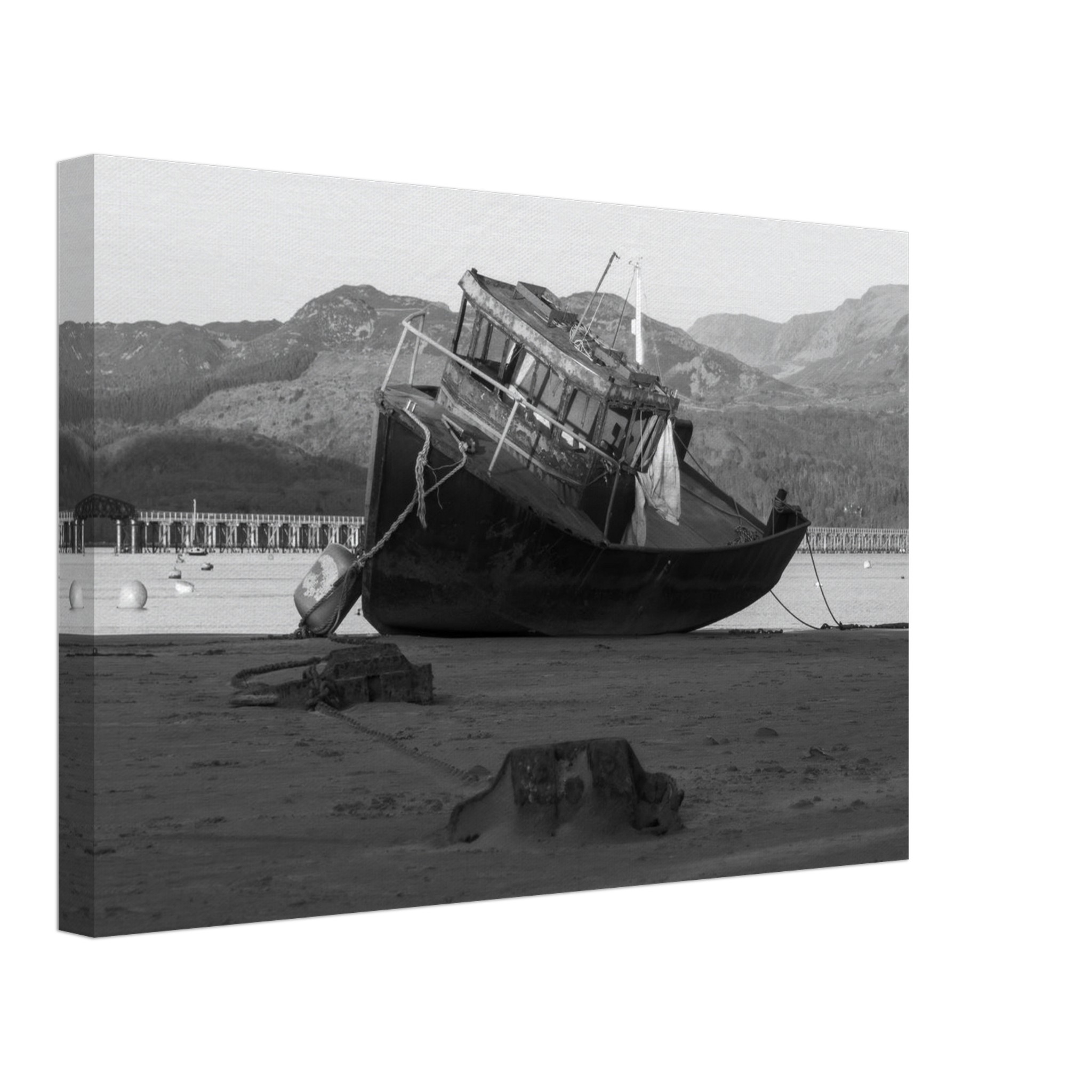 Transform your living space with our stunning Black and White Ship Wreck Canvas Print, capturing the dramatic beauty of a shipwreck at sunset on the pristine white sands of Barmouth Beach, North Wales. This artwork offers enhanced texture and a timeless allure, making it a focal point in any room.