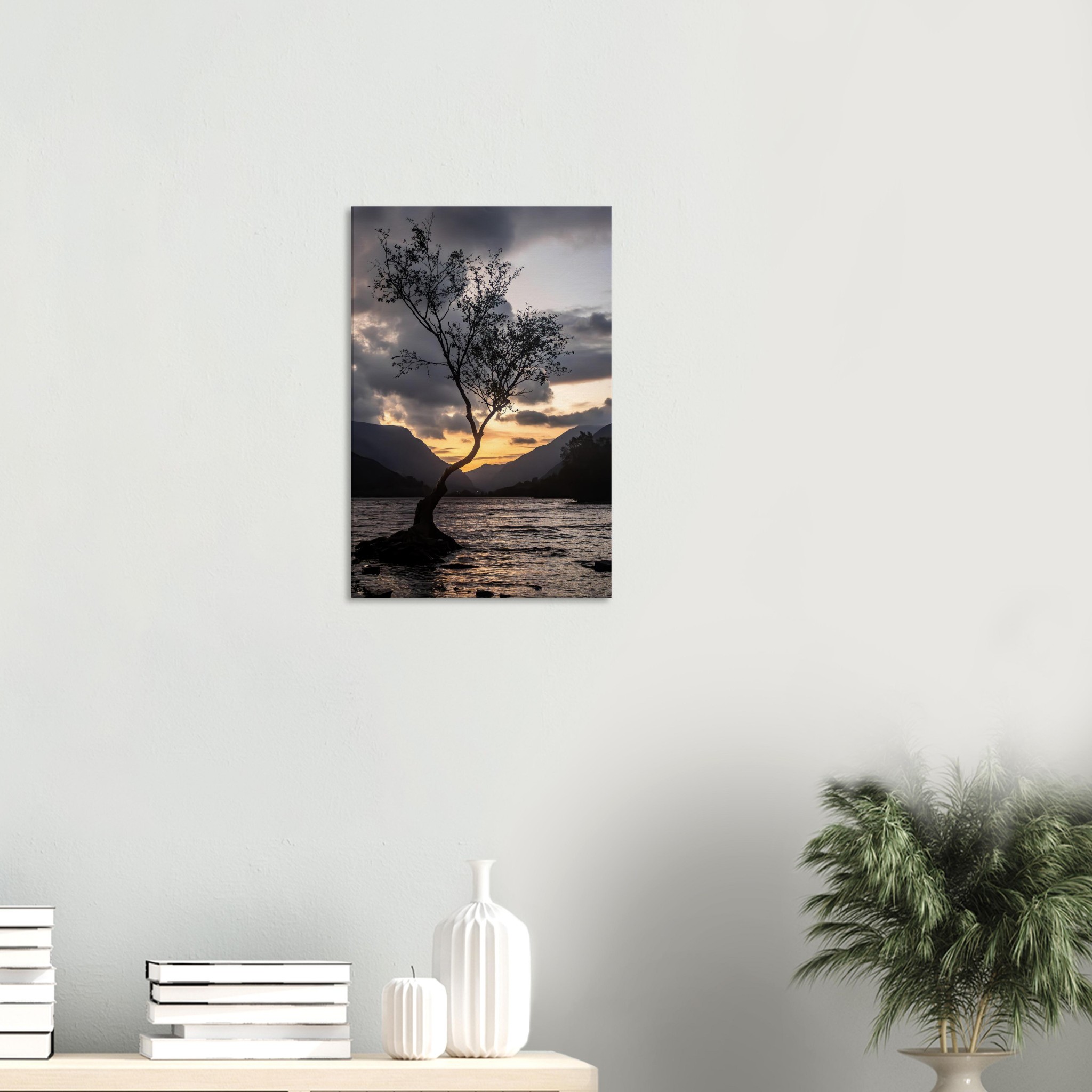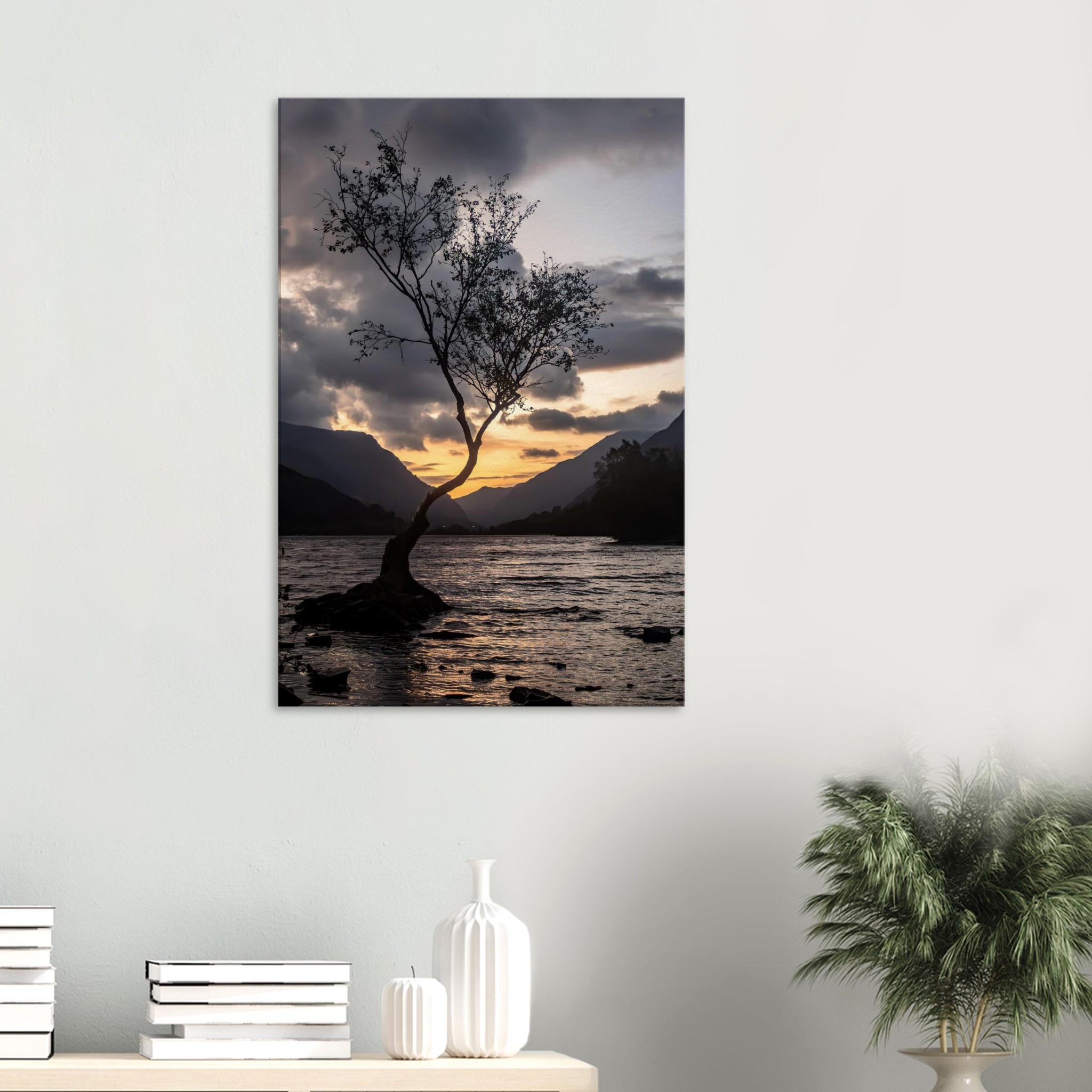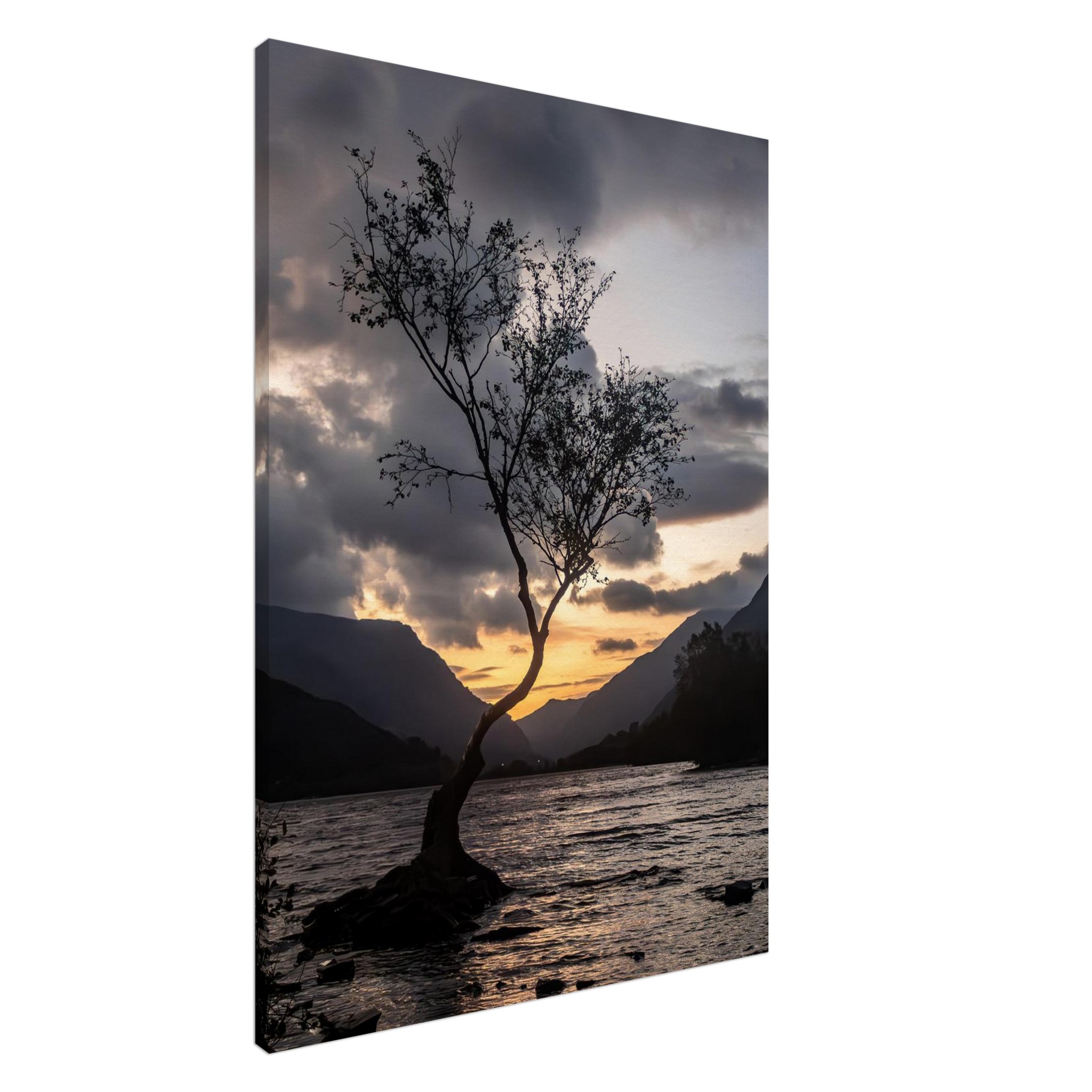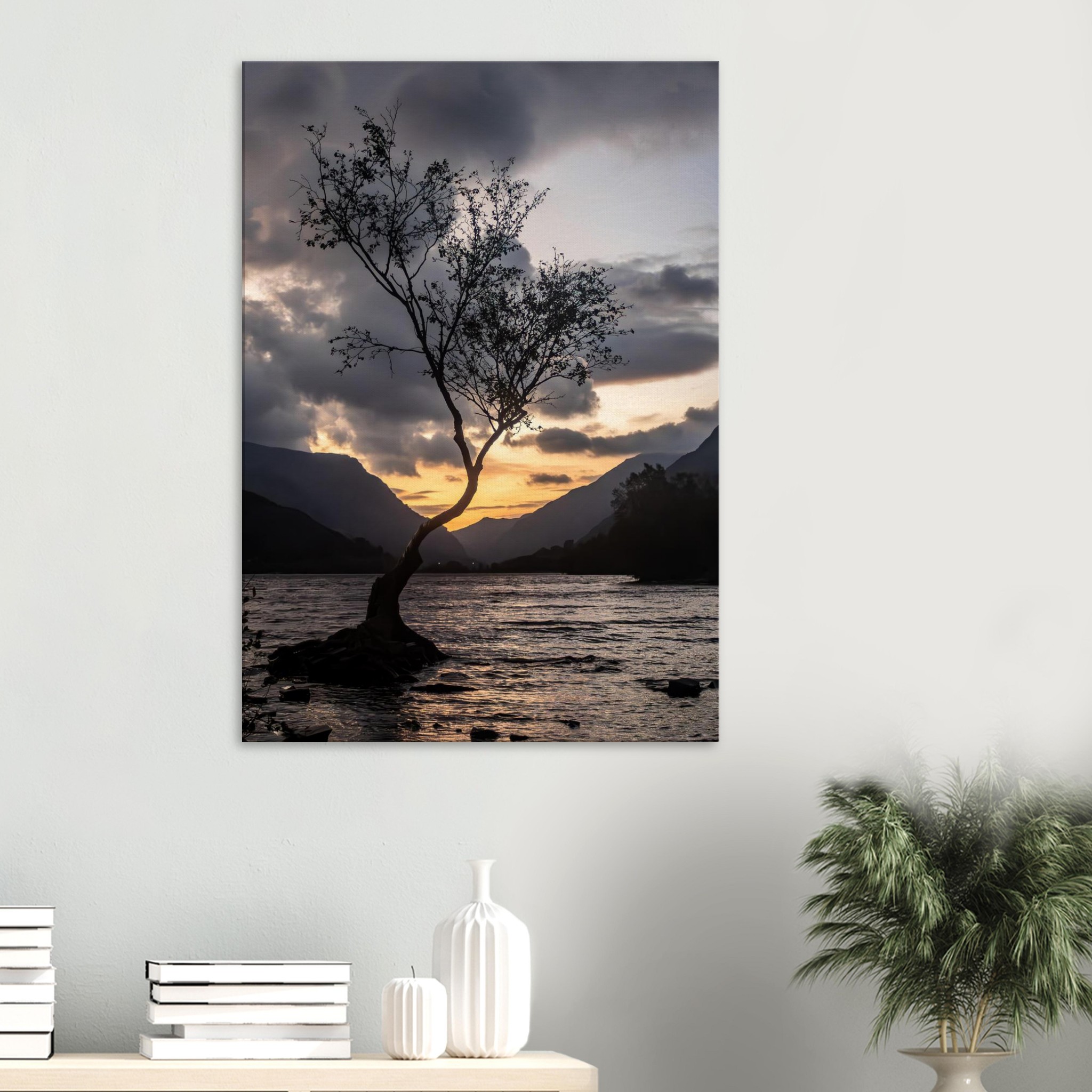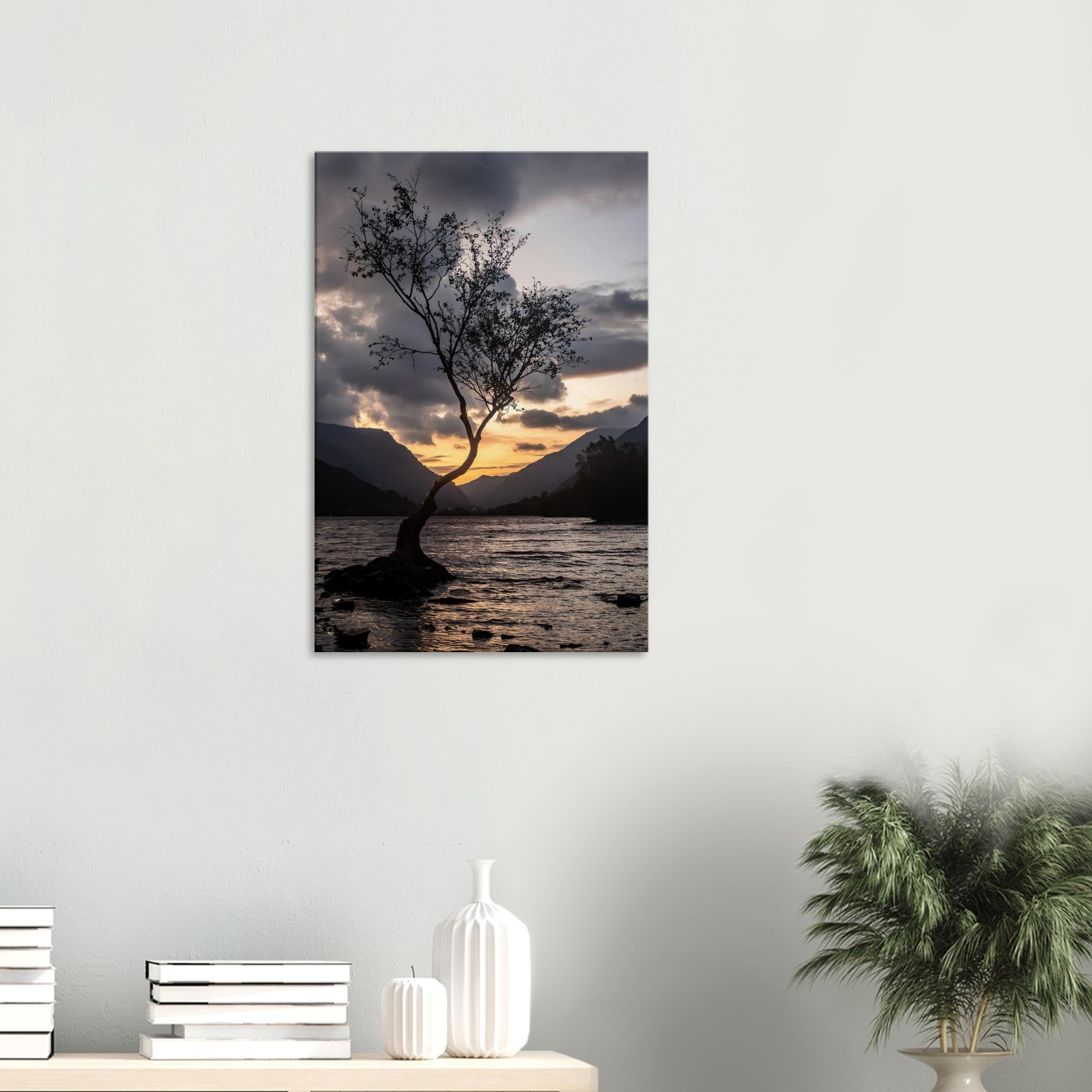 Transform your space with our breathtaking canvas print showcasing the tranquil beauty of the Lonley Tree Clear Grey Sky backdrop in Llyn Padarn and the majestic Yr Wyddfa. This stunning piece transports you to a serene summer day in Snowdonia, featuring a breathtaking nightscape of reflective waters, hills, and trees. Experience the peace of nature, captured as a perfect viewpoint for solitude seekers and travelers.