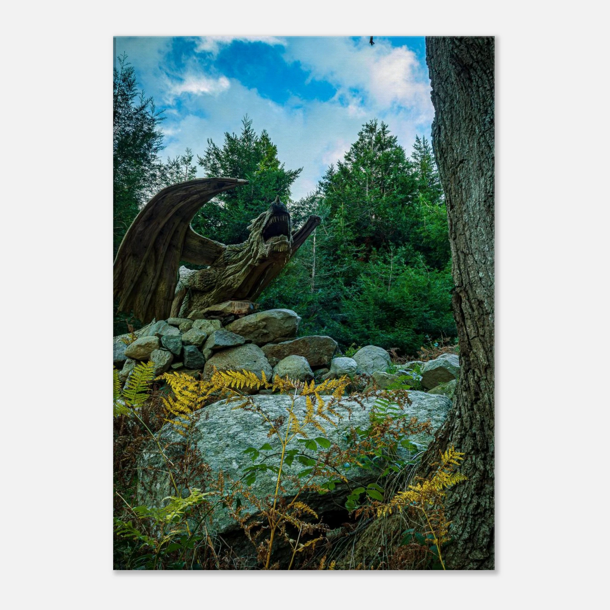 This striking canvas wall art print captures the awe-inspiring moment the Bethesda Dragon rises from his ancient slumber. Emerging with quiet power and smouldering intensity, he commands the scene as mist and fallen leaves stir around him. Behind him, an enchanting autumnal forest glows in rich seasonal tones, creating a dramatic stage for his resurgence.