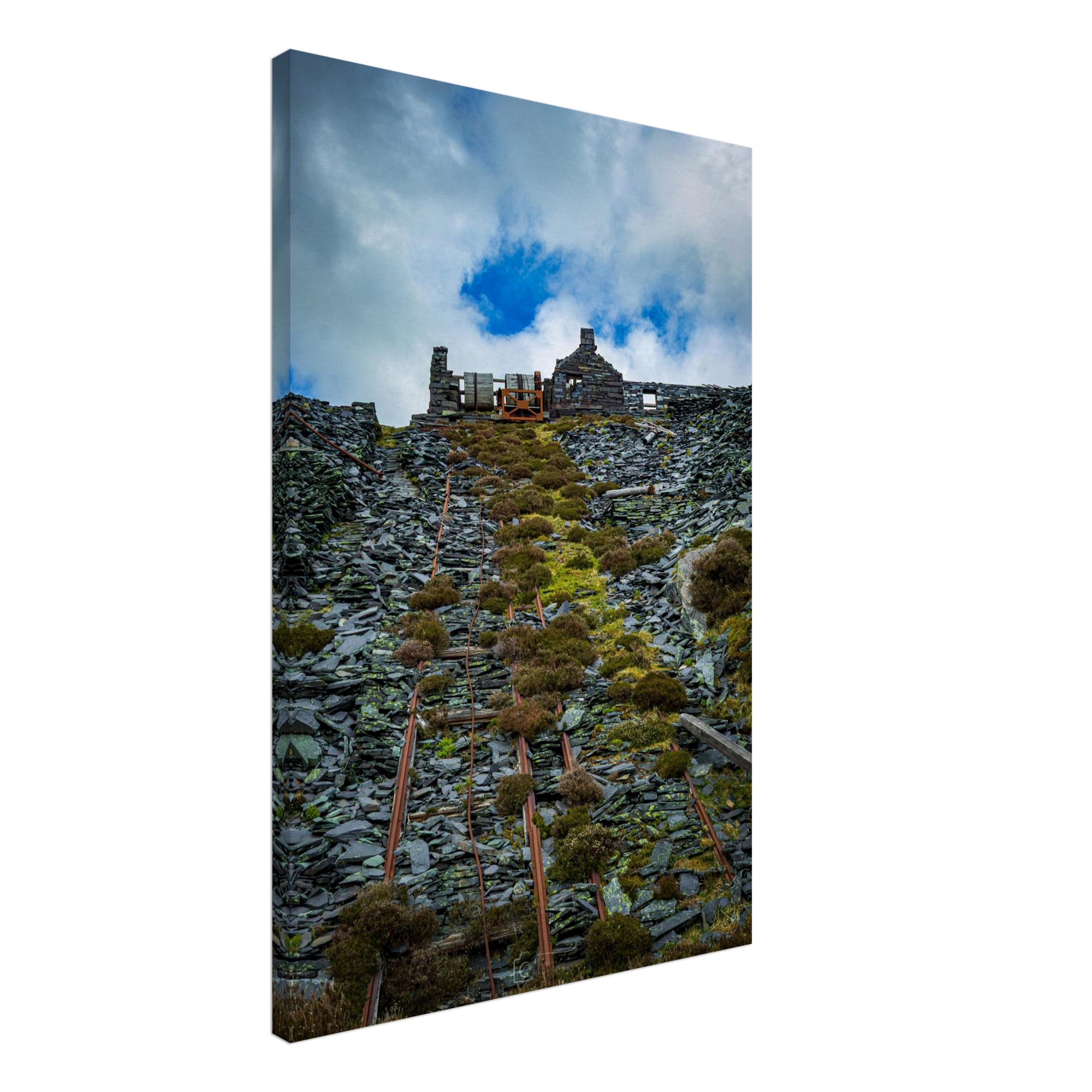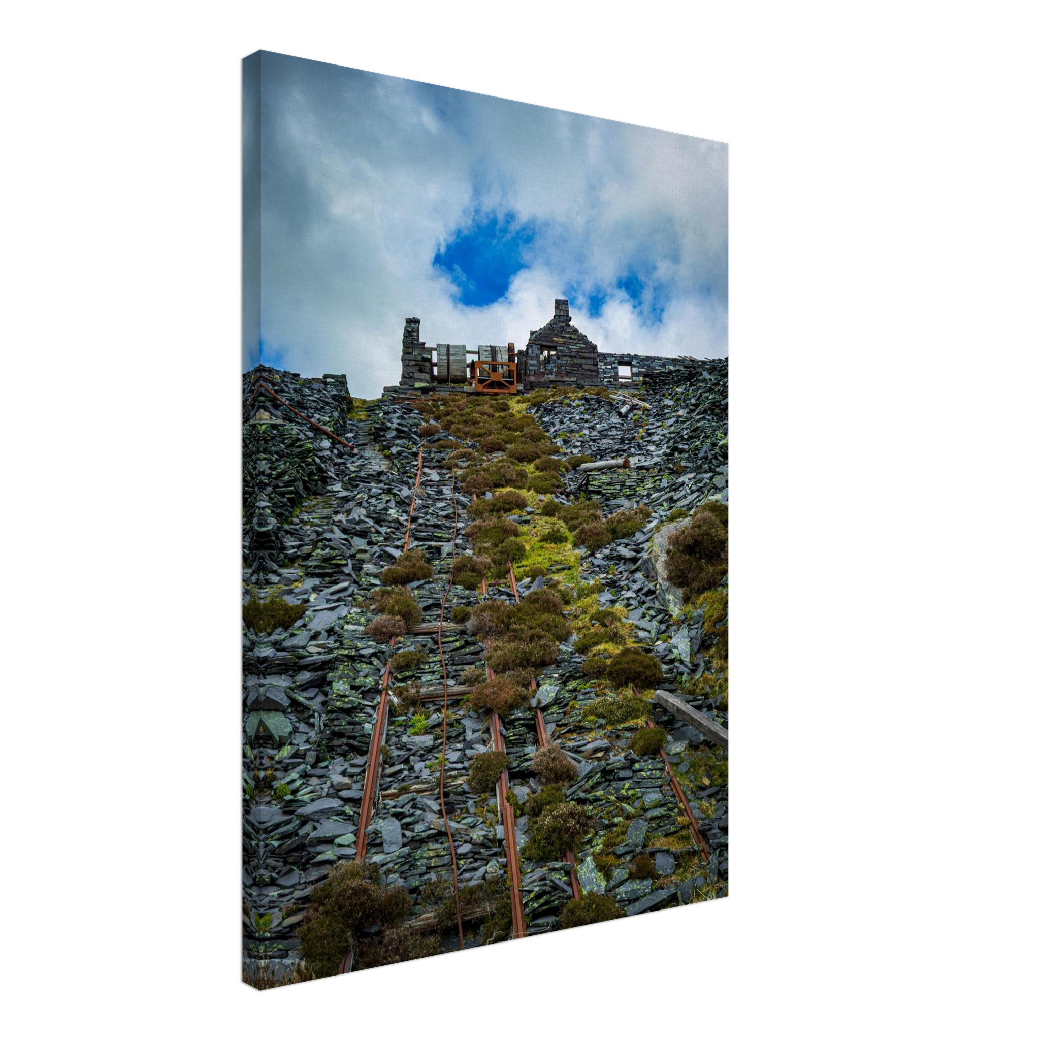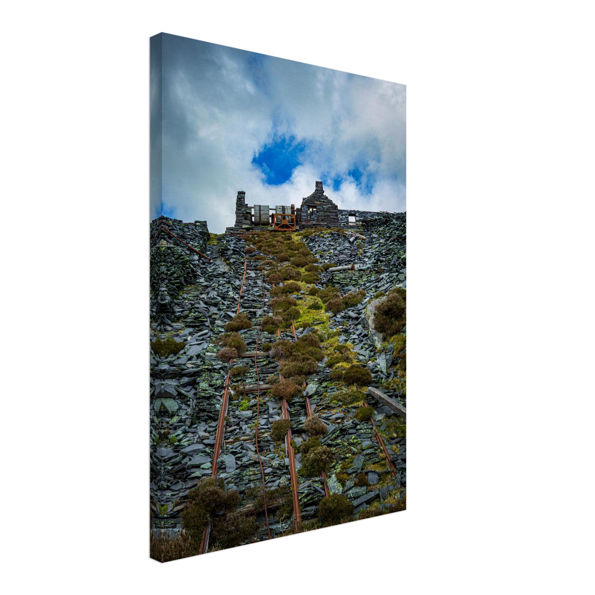 Transform your space with our captivating Ropes of Dinorwig Quarry, showcasing the stark beauty of industrial outbuilding views from the historic slate quarry. This unique artwork captures the remnants of towering machinery and weathered ruins, telling a story of a once-thriving industry amidst breathtaking natural landscapes. Perfect for history buffs and art lovers alike, this piece will evoke deep conversations and admiration from all who see it.