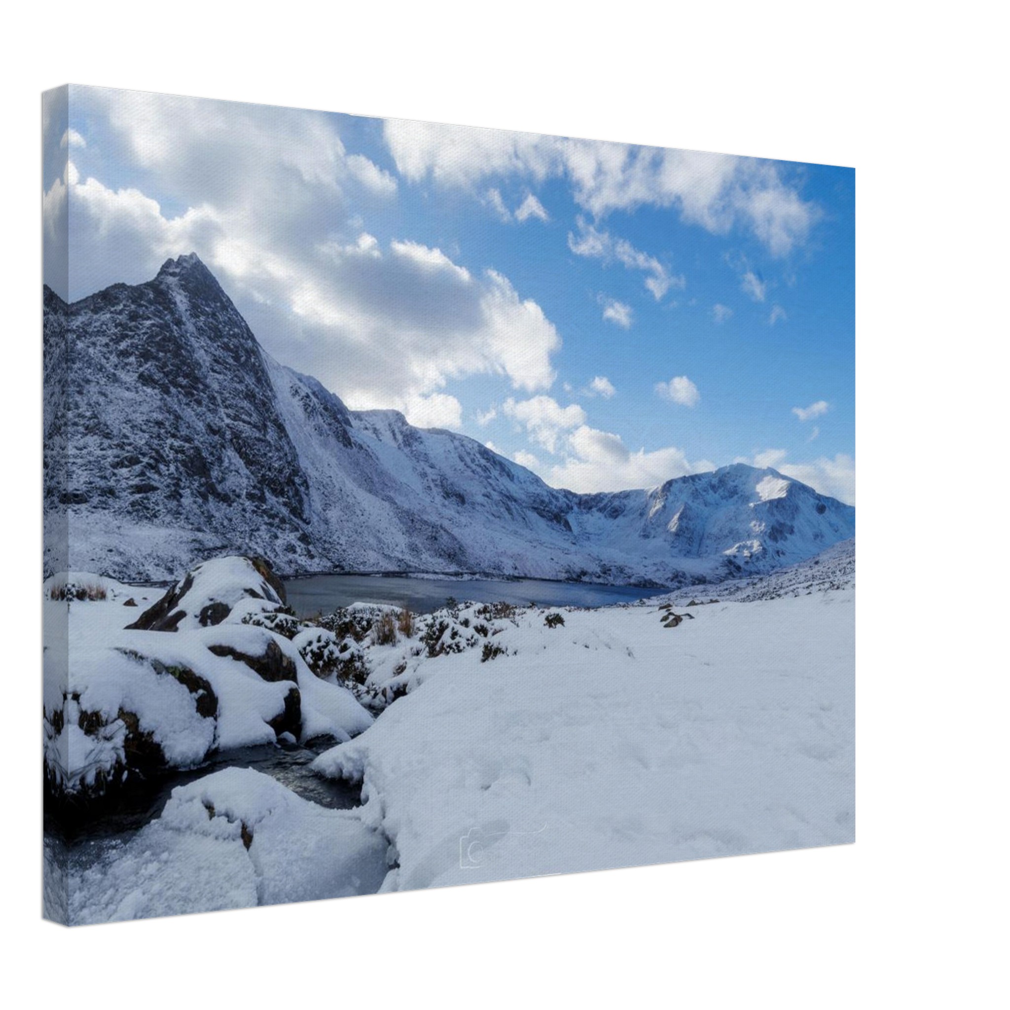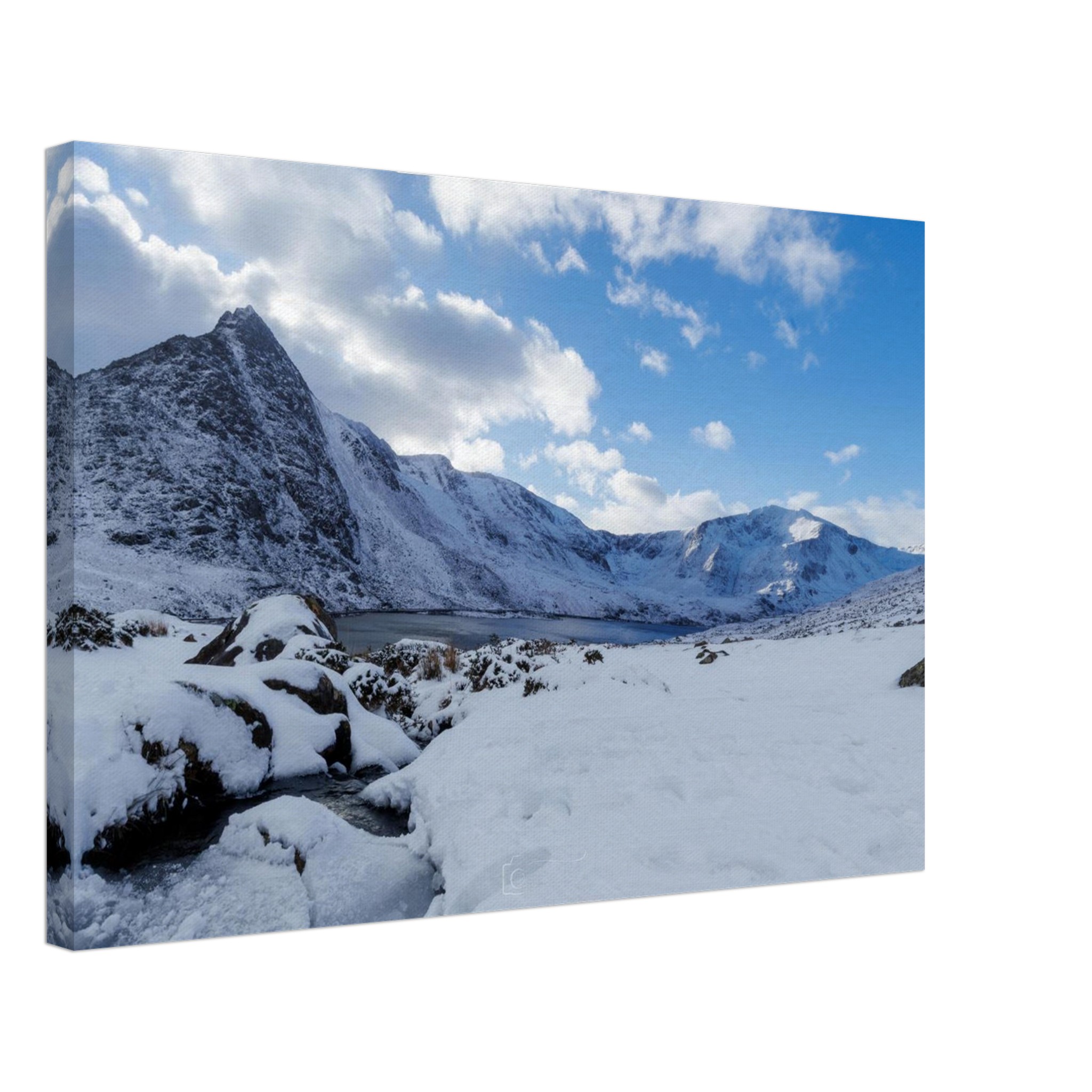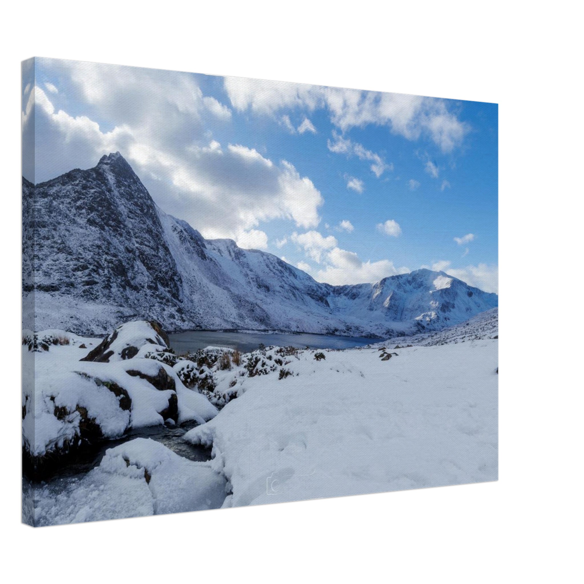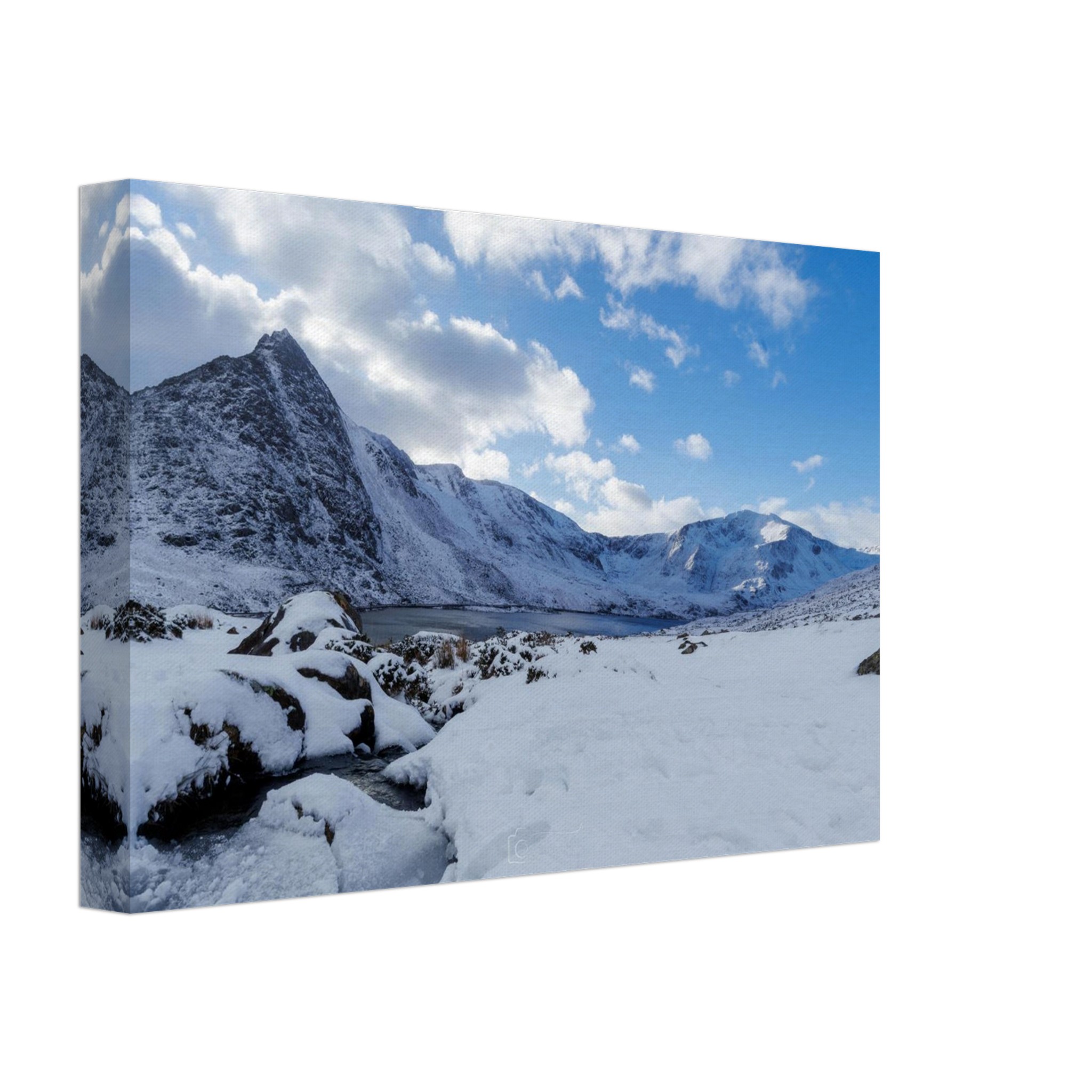 The winter scenery of Snowcapped Landscape of the Mighty Tryfan unfolds in a spectacular display of Snowdonia’s rugged and unspoiled beauty, a landscape that seems to capture the very essence of wild Welsh highlands. Towering jagged peaks pierce the grey, brooding sky, their craggy tors etched sharply against the muted backdrop, creating an awe-inspiring silhouette that symbolises the untamed spirit of this extraordinary region.