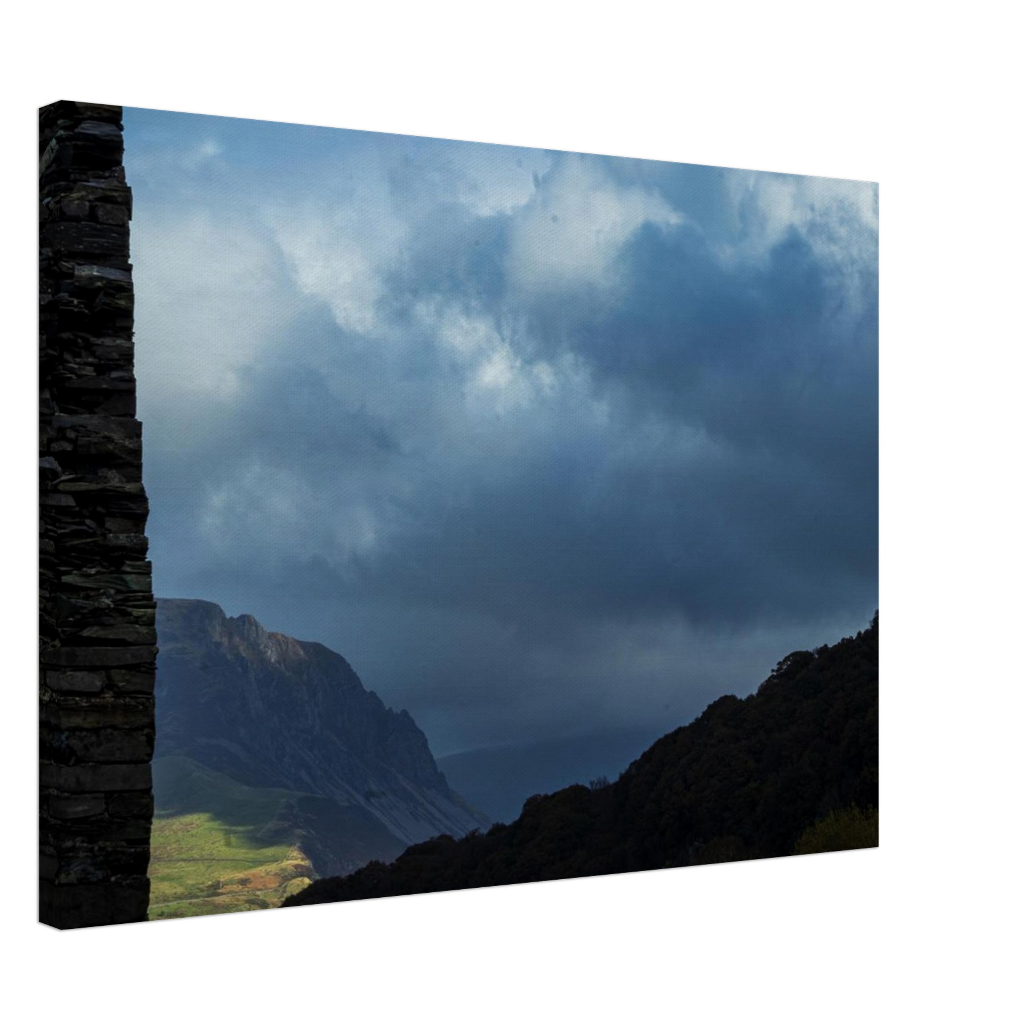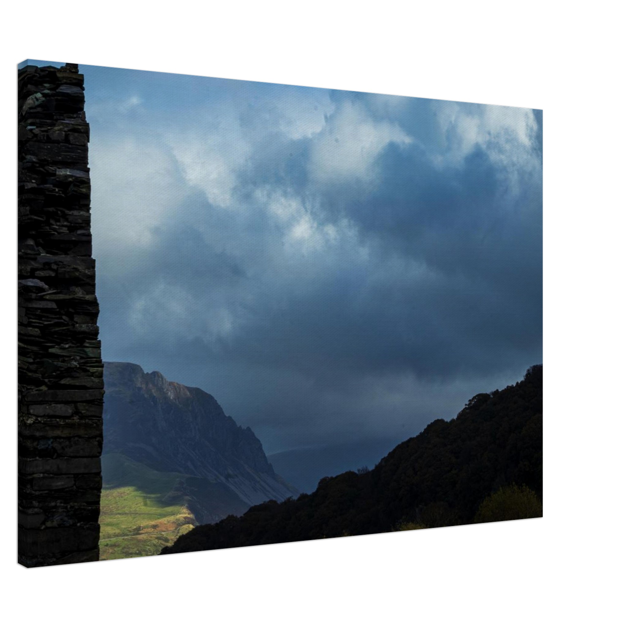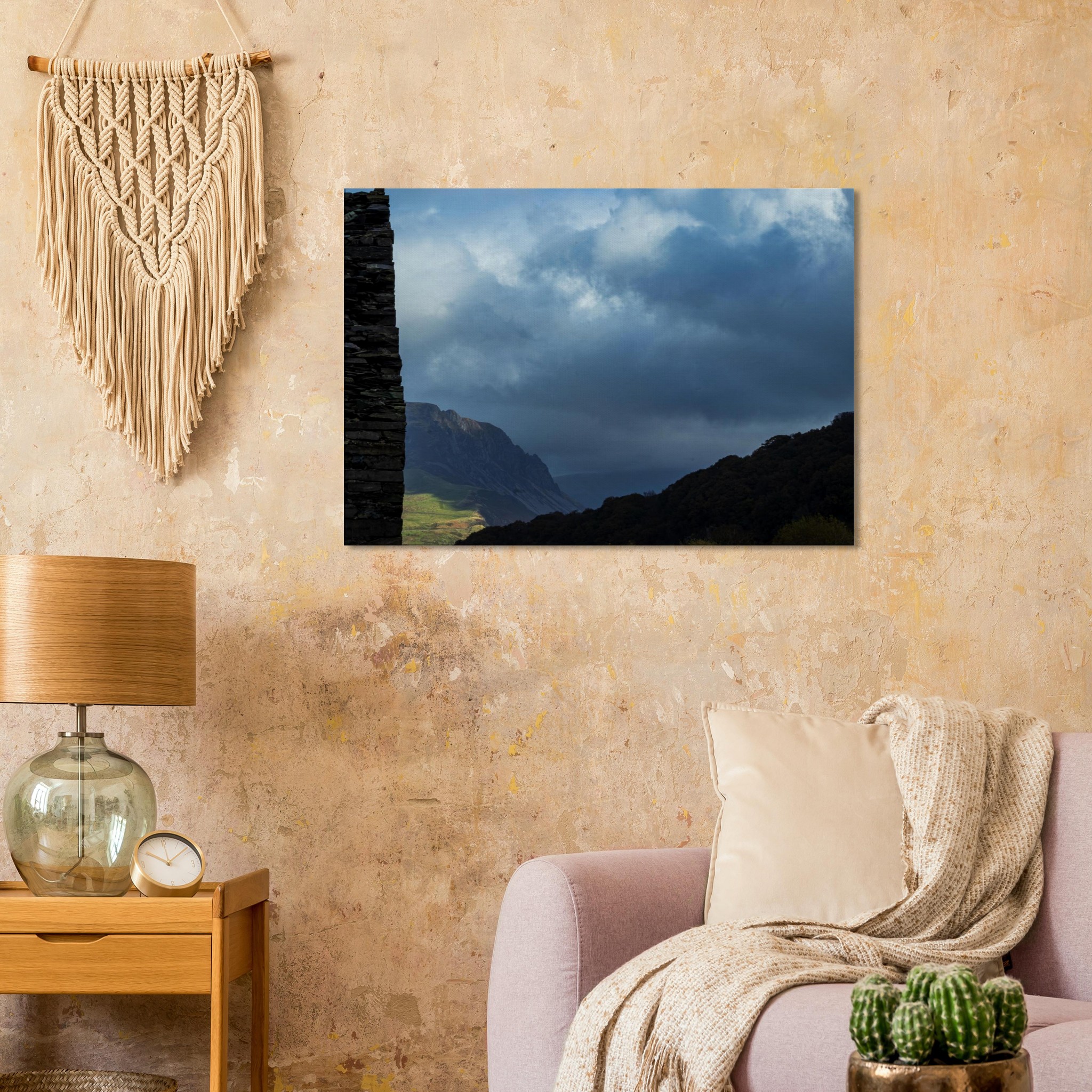 Transform your space with our captivating canvas print featuring a stunning scenic view of the Snowdonia ranges in North Wales. Captured from the edge of a disused dwelling atop the historic Llanyfni abandoned quarries, this artwork offers a glimpse into nature’s majestic beauty.