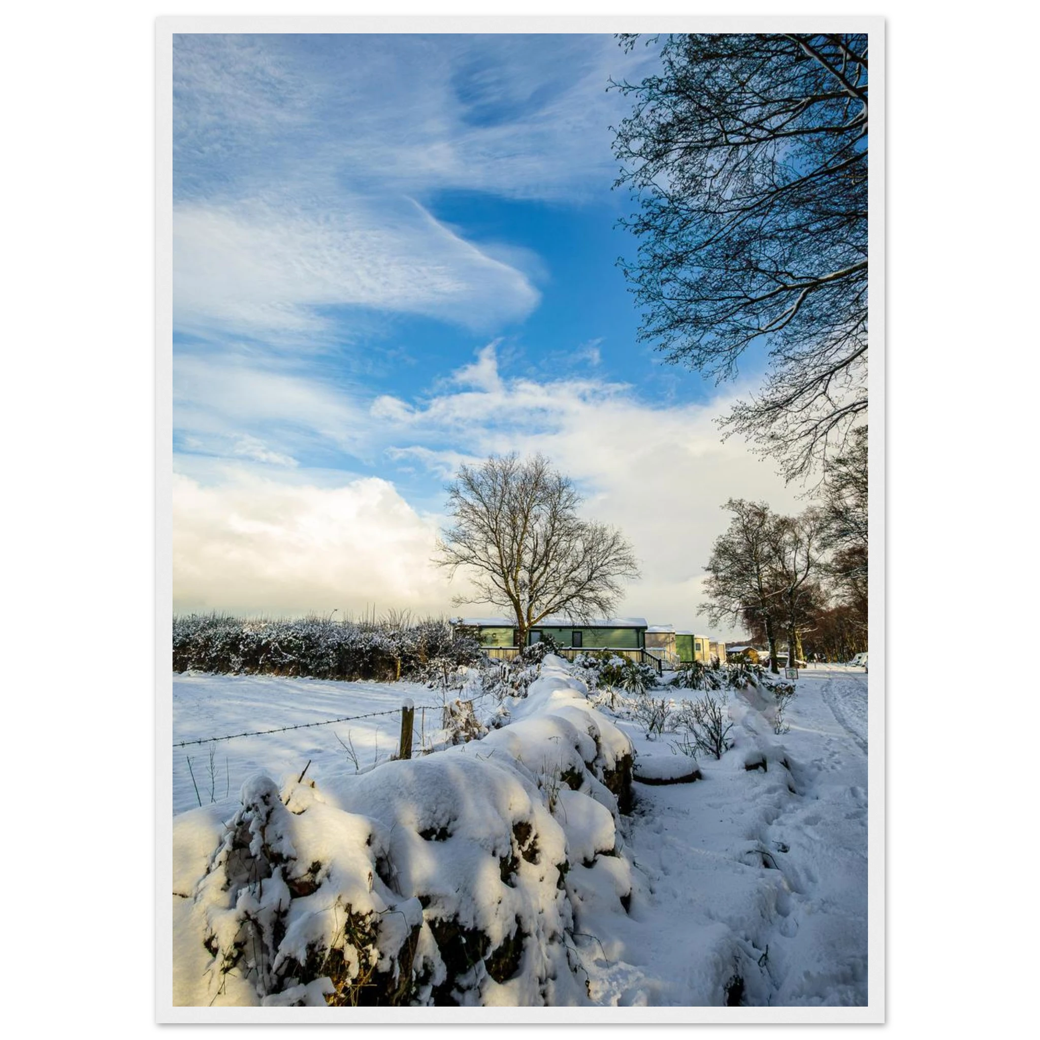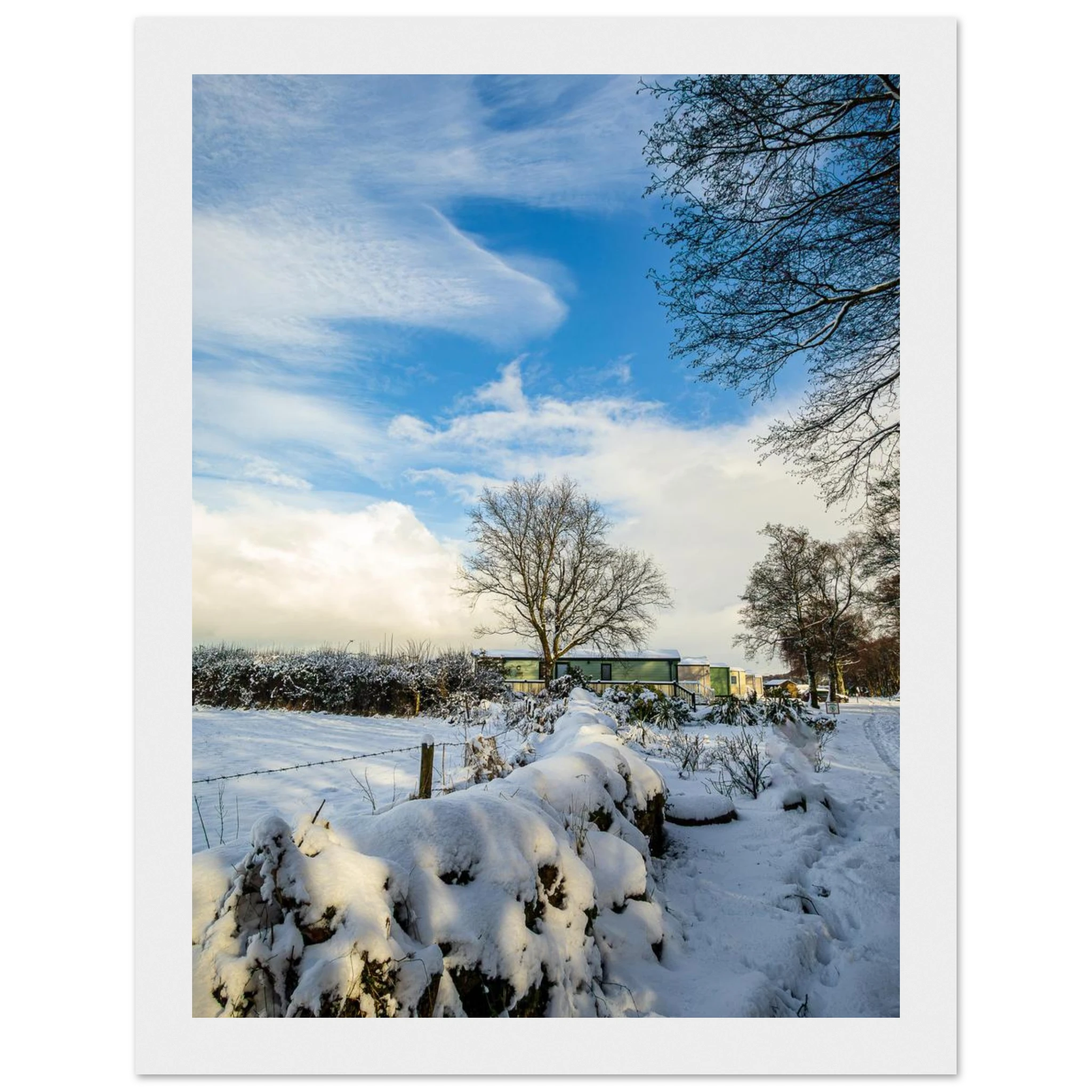 A peaceful winter morning at Tros y Waen Holidays, Whispers of Winter Wales—low sunlight flaring across pristine snow, bare trees casting long shadows, and a hush in the air that only fresh snowfall brings.